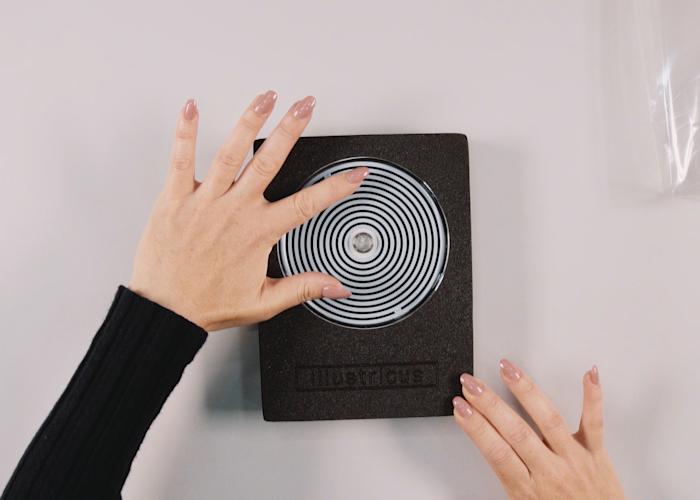 The screen-printed ink turns from dark brown to clear at a specific temperature, which when set between warm skin and cool ambient temperatures, shows hand-prints when touched — handling it becomes an hypnotic and engaging experience and reveals the hidden magic in a dull and utilitarian print technology.